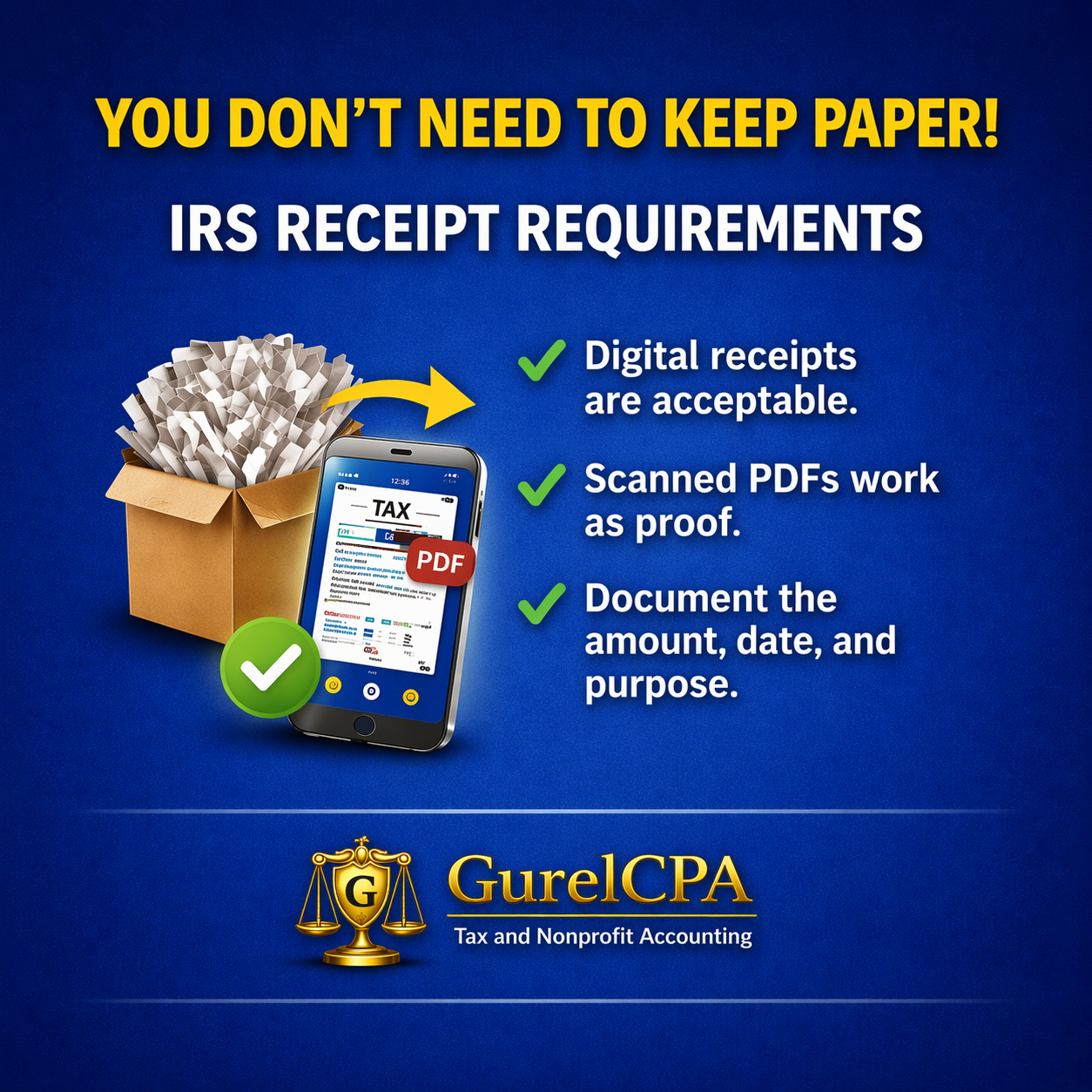 The IRS accepts digital copies of documents. Scanning and securely storing records electronically can reduce physical clutter, improve organization, and provide backup protection.